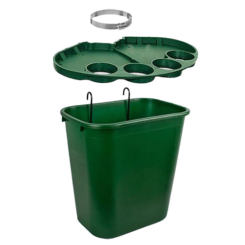 Convenient hanging receptacle for beverage cups and other court trash. Attaches to Cooler Stands, fences or other items by two hooks. Choose from Black or Dark Green.