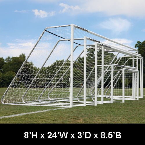 Durable aluminum construction withstands rough weather and the repeated impact of shots on goal. 8’ x 24’ model meets NFSHSA specifications.