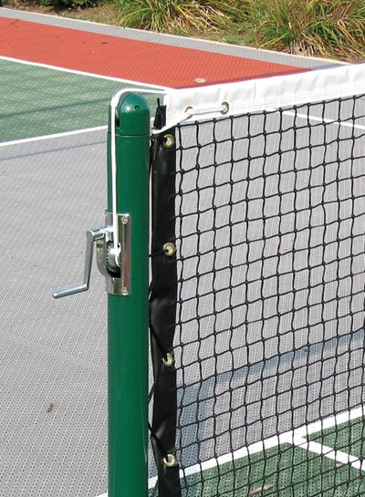 POST The 3” OD round tennis post is constructed from heavy-duty 11-gauge steel. Systems are finished with a black or forest green baked-on polyester powder coat to resist rust and increase durability. Integrated welded steel lacing rods are included for a professional net installation.