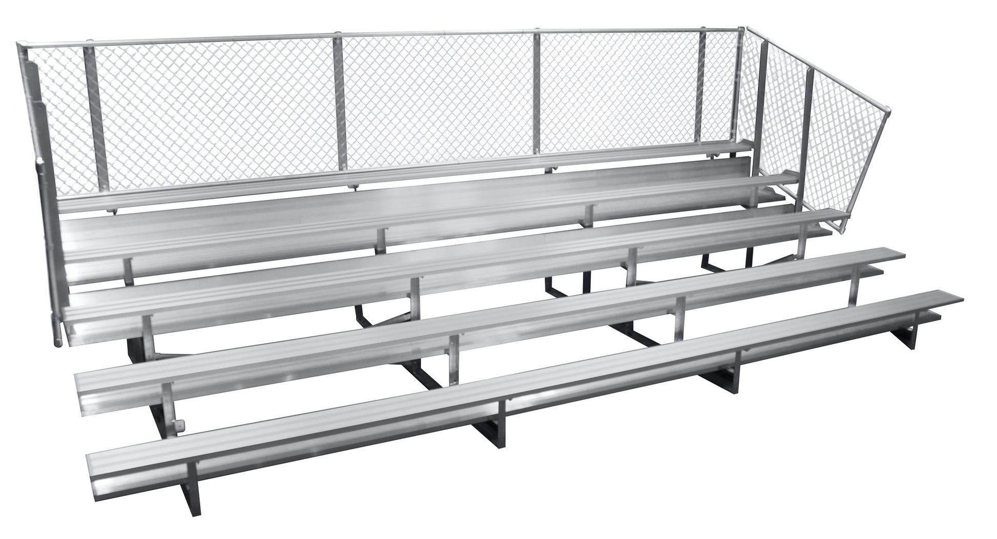 Root for you favorite team in comfort with Spectator Series seating. The GSNB0521 stationary bleacher with chain link guardrail seats 70 fans on 5 rows of 21' long aluminum seat planks and single 10" wide foot planks. The first row of seating starts at 17" off the ground with 8" rise and 24" row spacing.
